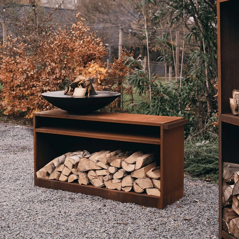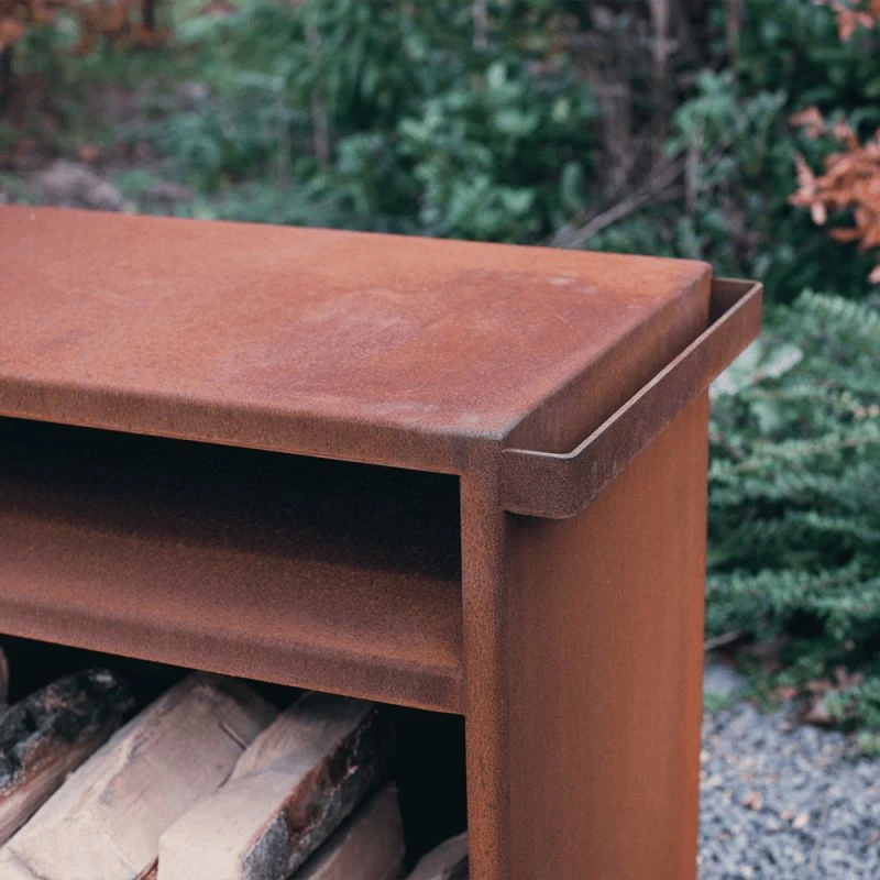 Plancha avec son support de travail 2 en 1 qui vous permet de cuisiner et de stocker votre bois ! En acier corten et brasero au choix, de 80 ou 100 cm de diamètre.